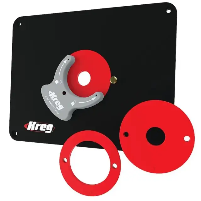 Płyta jest wyposażona w pierścienie redukcyjne Level-Loc, które umożliwiają łatwą zmianę rozmiaru otworu wokół freza. Pierścienie redukcyjne montuje się do płytki za pomocą dołączonego klucza oczkowego.