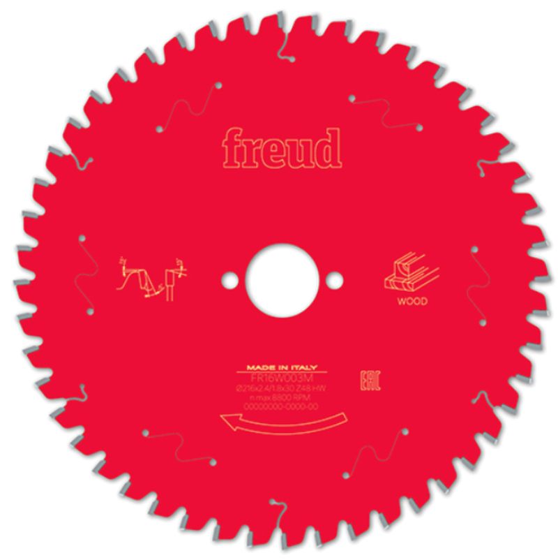 Tarcza przeznaczona do precyzyjnego cięcia poprzecznego i wzdłużnego w drewnie litym, sklejce, MDF i materiałach kompozytowych. Model FR16W003M ma 48 zębów o profilu ATB oraz ujemny kąt natarcia –5°, dzięki czemu zapewnia czyste, gładkie i kontrolowane cięcie bez wyrwań. Solidny korpus o grubości 1,8 mm i rzaz 2,4 mm gwarantują stabilność i cichą pracę w ukośnicach i pilarkach kątowych 216 mm.