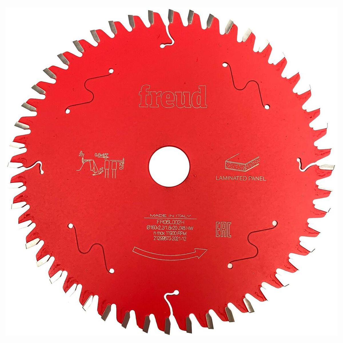 Tarcza do płyt laminowanych o średnicy 160 mm z uzębieniem HLTCG i kątem natarcia -5°, przeznaczona do pilarek ręcznych i zagłębiarek.