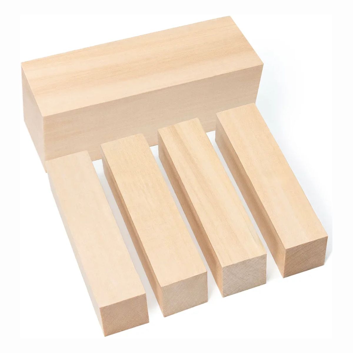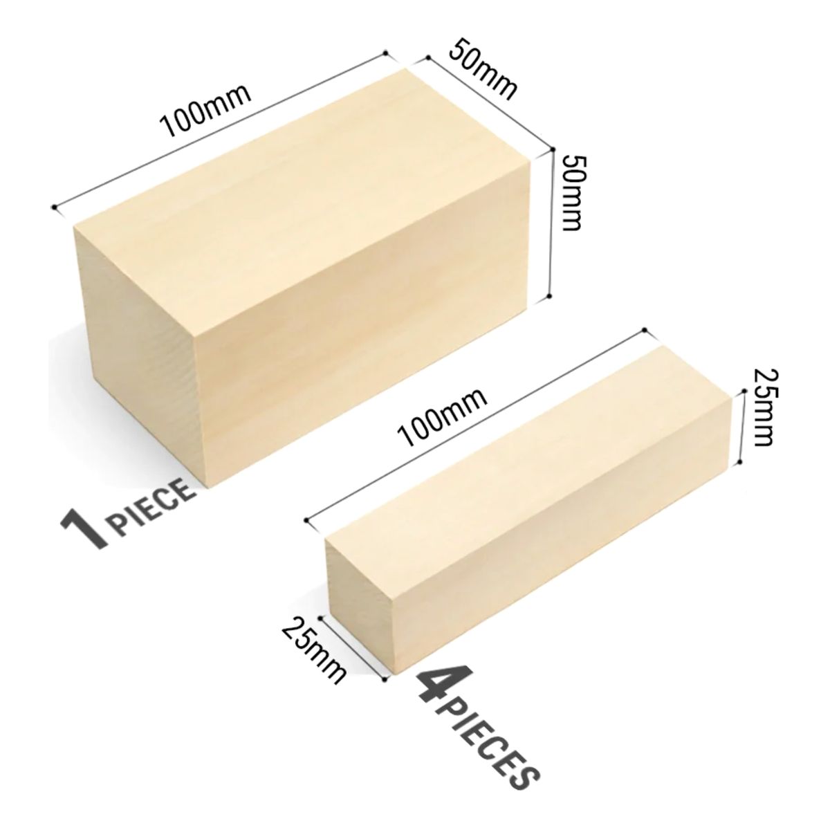 Zestaw zawiera pięć klocków z drewna lipowego: jeden większy i cztery mniejsze.
